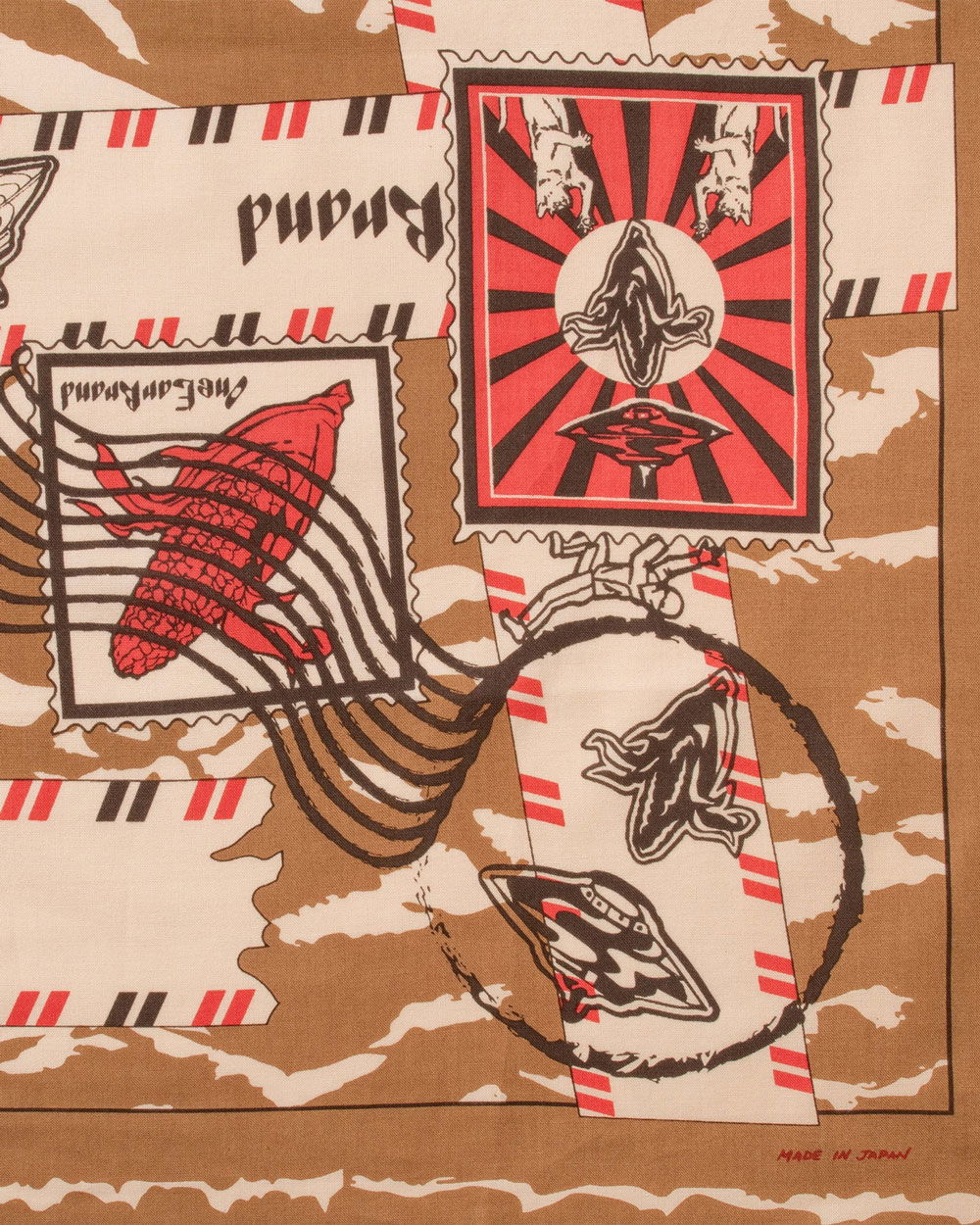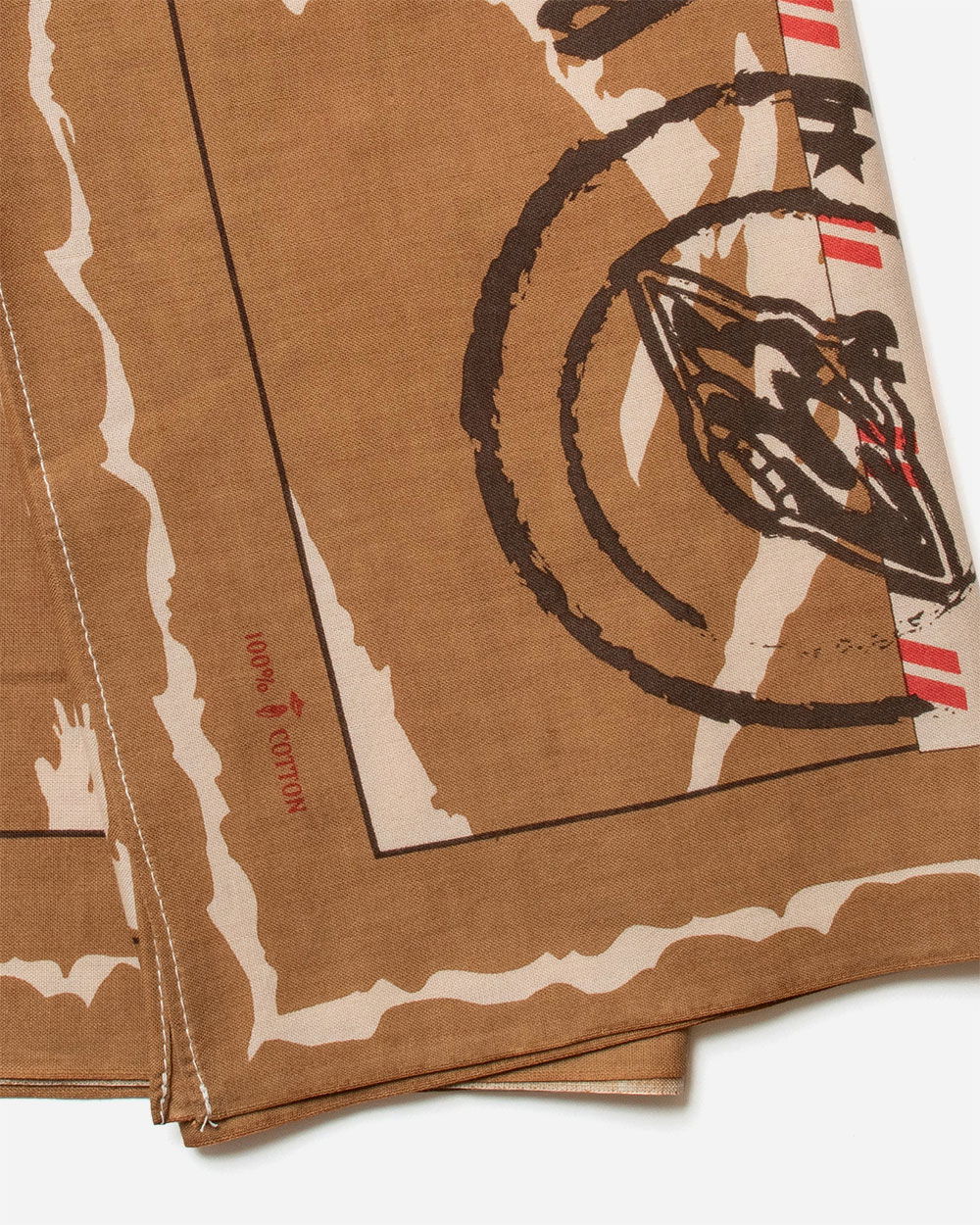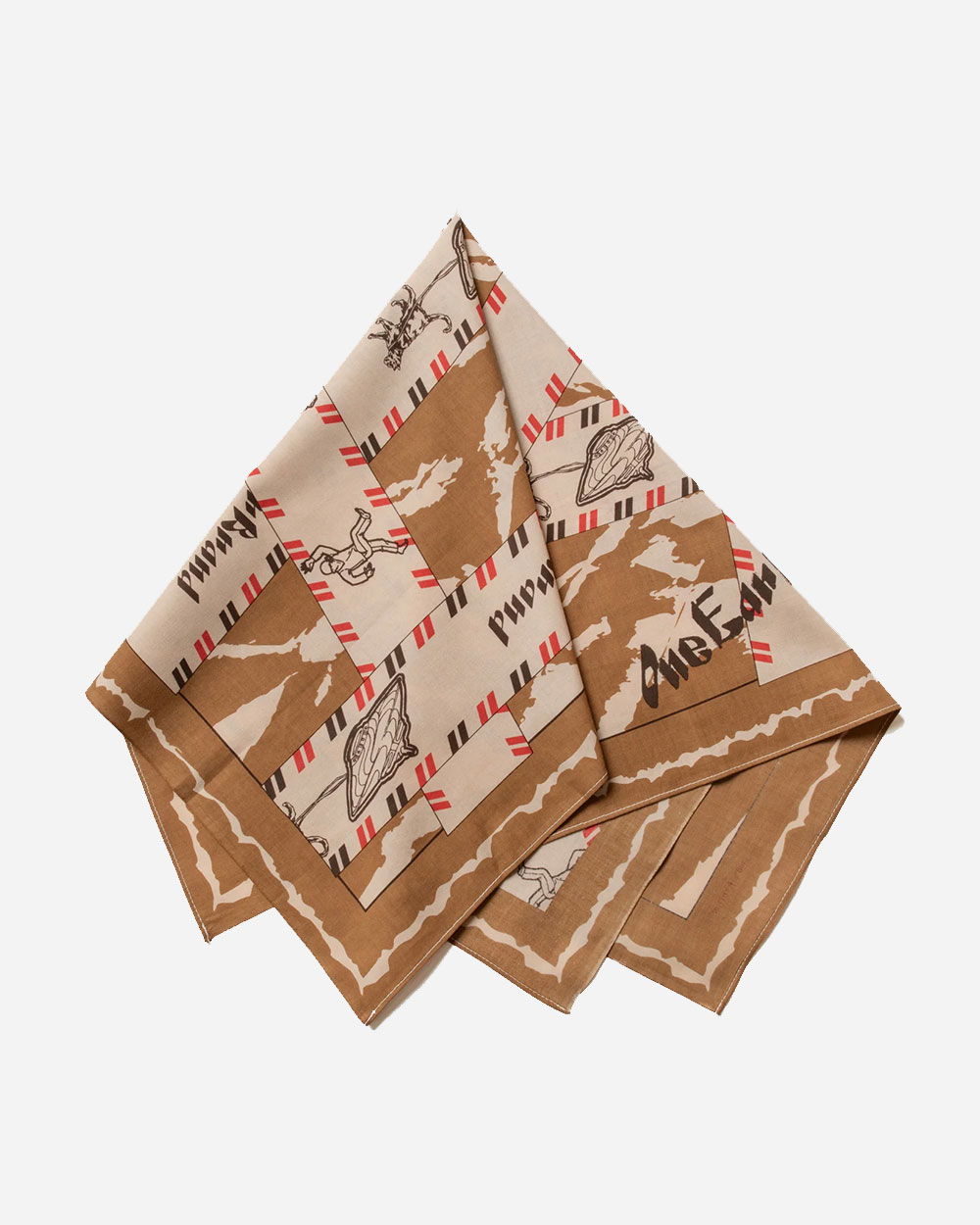 The idea for the One Ear Brand Hermetic Gift Box bandanna came from an old, intriguing design by Hermes. One Ear liked this idea and started to make one similar to it but, as it were sent through international mail. So they took our design and artistically sent it through the mail with torn tape, faded stamps, wrinkled cardboard, etc. Result: the design is perfect for the “wabisabi” admirers out there.
