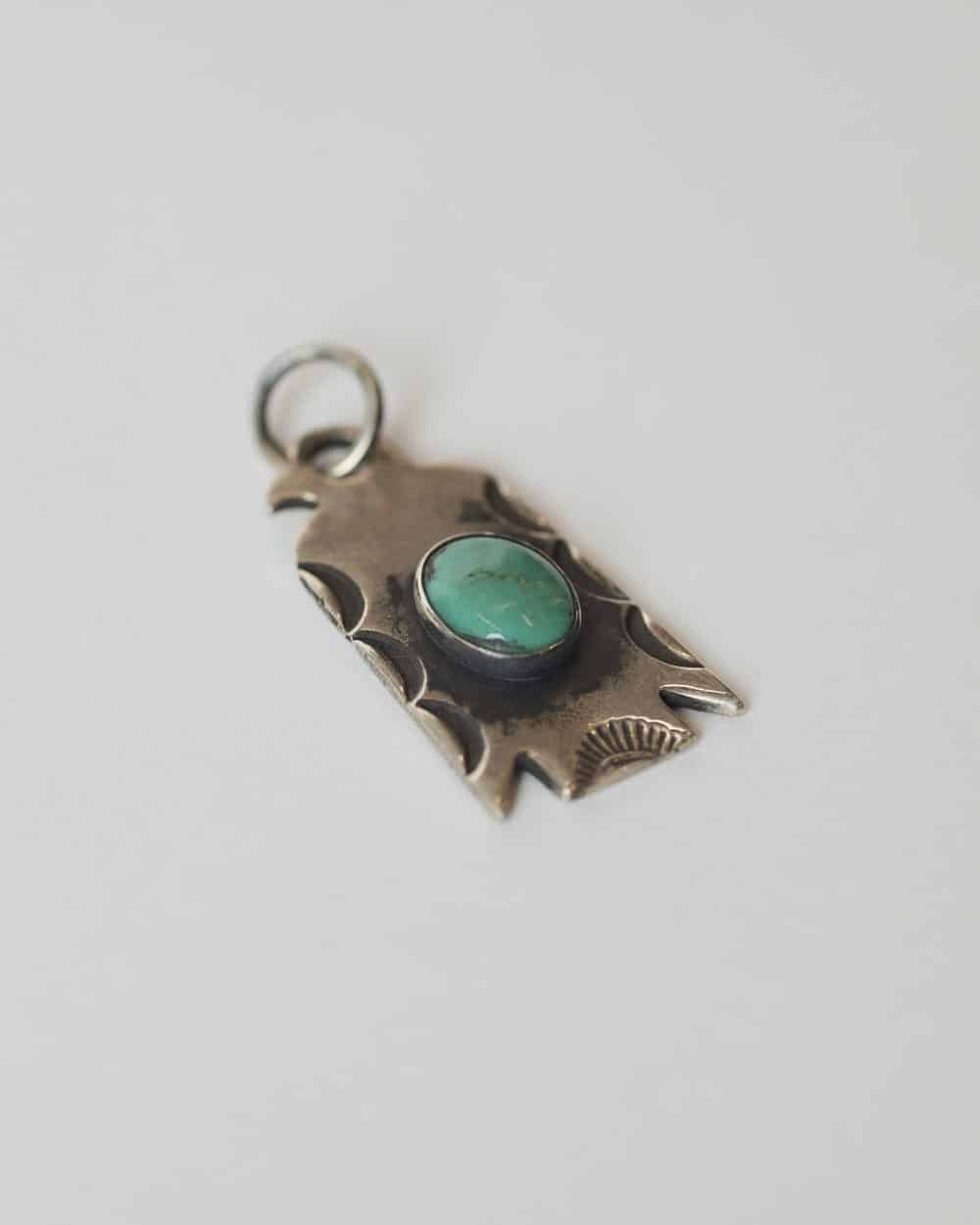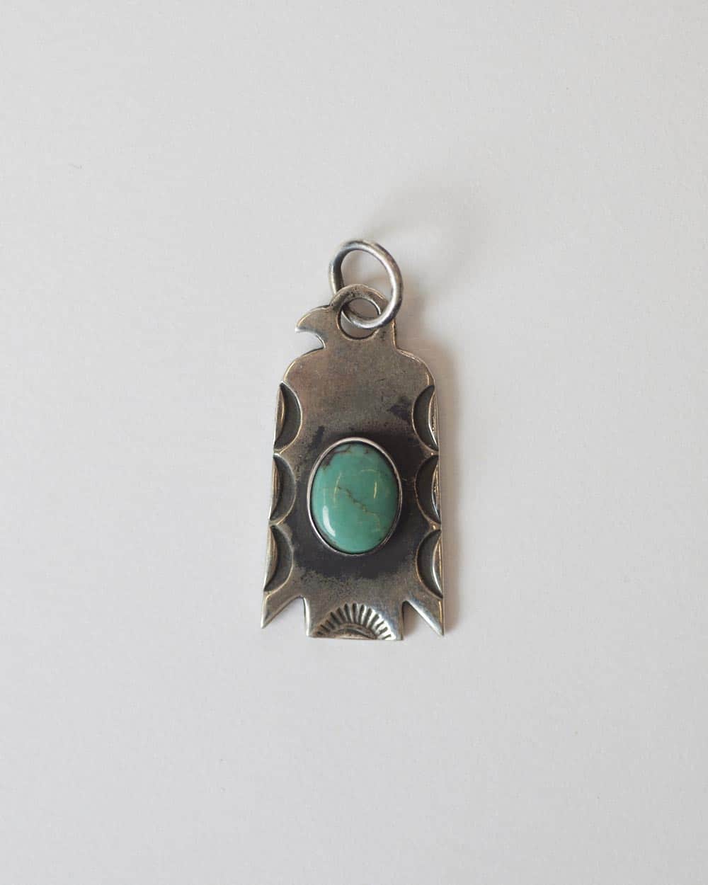 The Mini Turquoise Bird Charm is inspired by souvenirs sold to tourists in the South Western USA during the 1930s. It is designed to be worn on a chain, either alone or stacked together with multiple pendants. The Native Thunderbird Symbol represents power, protection, and strength and is often seen as the most powerful of all spirits.