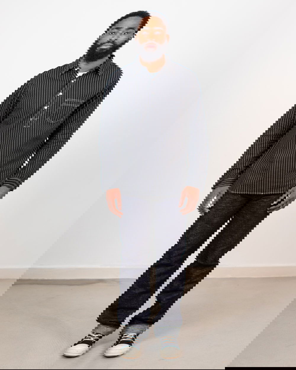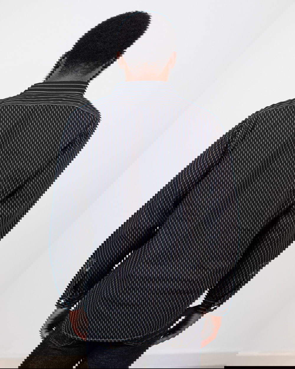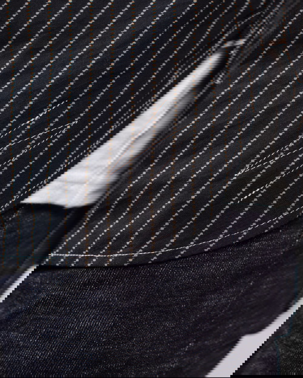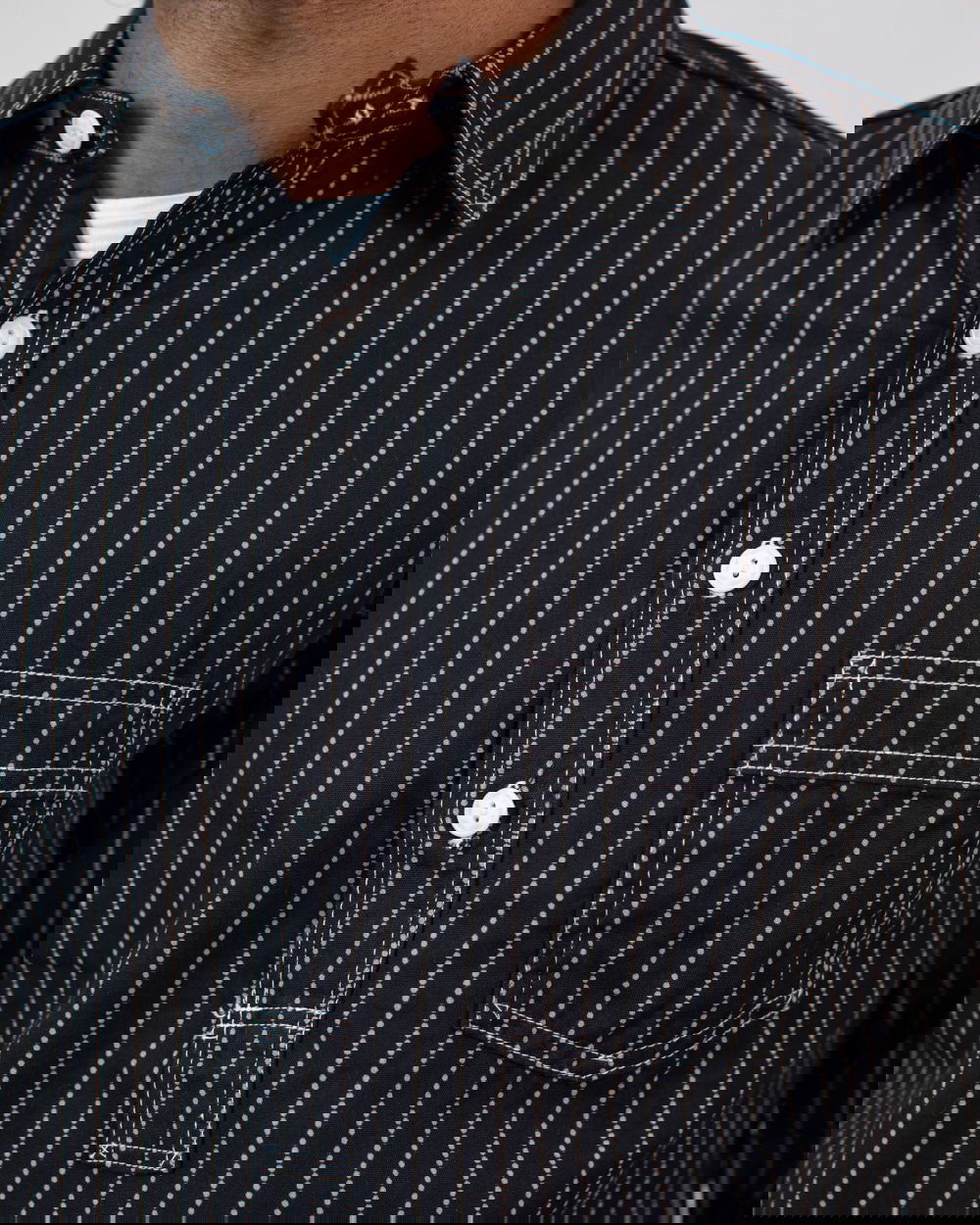 It is made from a selvedge discharge-dyed dot stripe Wabash fabric, milled in Japan, in both indigo and black sulphur dye in a versatile, year-round 5 oz weight. Both the indigo and sulphur fabrics used will fade with washing and wear so you can enjoy the unique ageing characteristics your garment takes on.